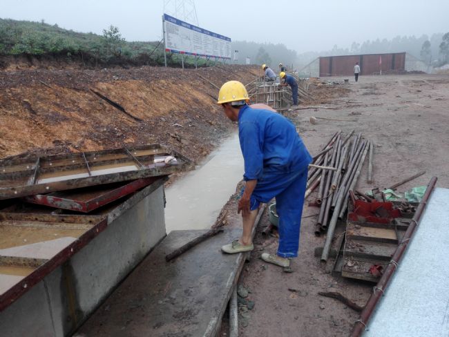 为赶进度,坚持雨后在泥泞中挡墙施工